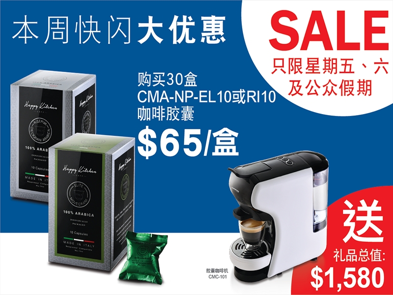 德国宝快闪优惠震撼登场!由8月9至11日期间(本周五、六、日)亲临九龙湾MegaBox厨柜及电器陈列中心,购买30盒指定款式Happy Kitchen咖啡胶囊(CMA-NP-EL10 / CMA-NP-RI10)即送你胶囊咖啡机(CMC-101)一部,礼品总值$1,580,数量有限,送完即止!