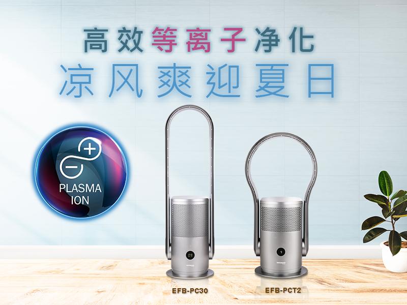 等离子空气净化风扇(EFB-PCT2)及 UVC等离子空气净化风扇(EFB-PC30)内置等离子产生器,释放等离子净化空气,有效去除空气中的悬浮微粒、细菌、异味、挥发性有机物甚至抑制病毒,减低污染物浓度以改善空气质素。