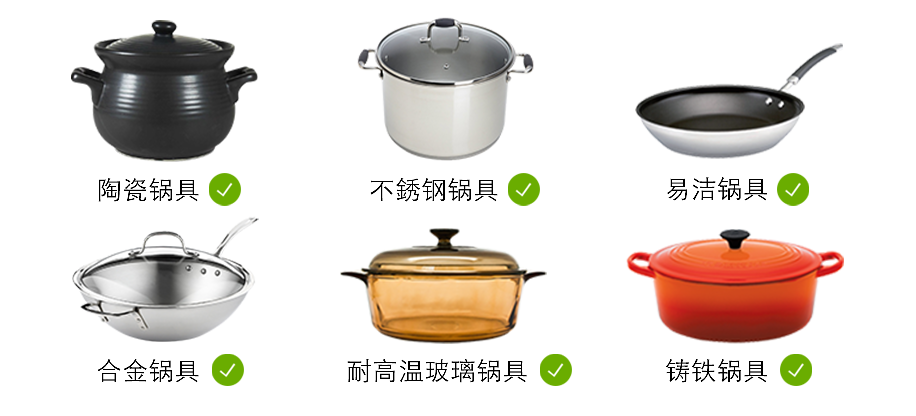 德国宝全新嵌入式双头电磁电陶炉的电陶炉头无需配合特定锅具使用,不论材质或物料,只要是耐热锅具均可加热!煲中式药膳用瓦煲、炆咖哩牛腩用陶瓷锅、煮热辣辣煲仔饭用砂锅,煲老火靓汤用耐高温玻璃锅;甚至不銹钢锅具、易洁锅具、合金锅具、铸铁锅具、铝质锅具等都一概适用,真正乜煲都用到,让你可根据食材的特性或烹调方式,自行选择适合的锅具,获得更完美烹调效果!