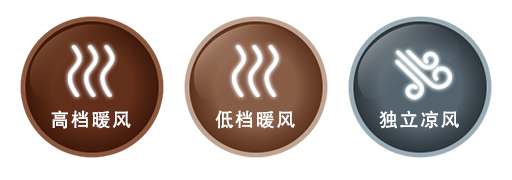 配备「强劲暖风」、「环保暖风」及「凉风」三大模式选择。