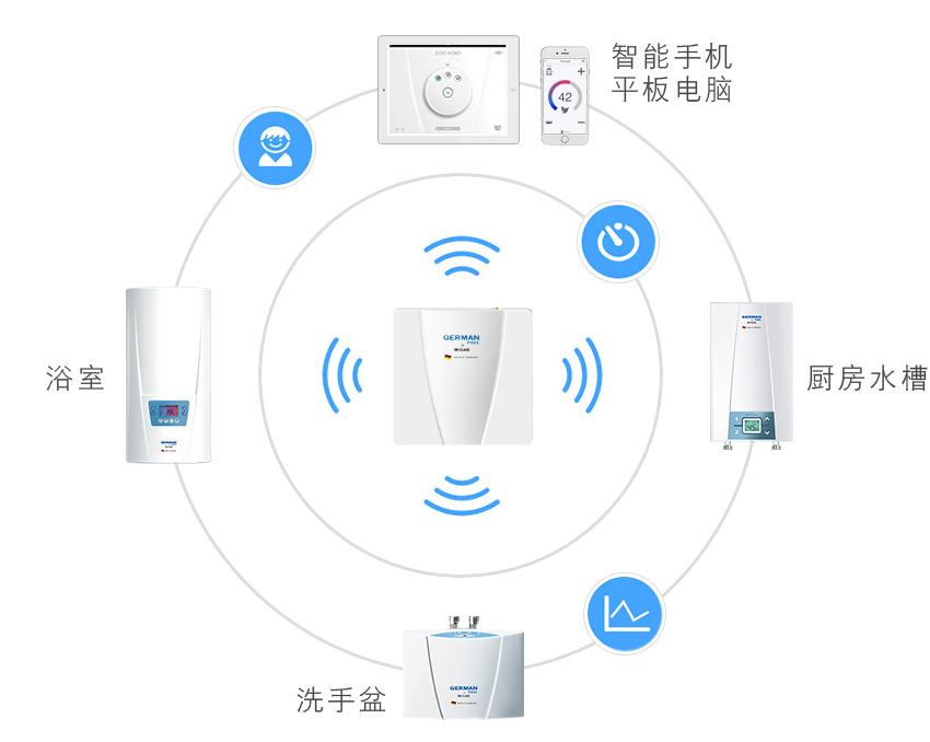 智能热水控制系统包括无线网路控制器及无线电适配器,适用于DSX、DEX、CFX、CEX和GPI-M8等型号的德国宝家庭即热式热水器,并提供流动应用程式,方便控制出水温度及取得热水器的运行参数,并管理使用者的个人档案及资料数据。