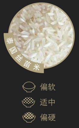 幼长甘香,色泽洁白,口感烟韧弹牙。泰国丝苗香米在泰国东北地区才可种植,带天然茉莉花香,饭粒幼长香糯。