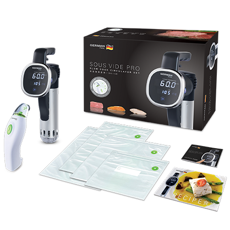 德国宝低温慢煮套装贴心配备USB充电真空保鲜机及多款不同尺寸真空保鲜袋,无需购买额外配件,不再需要用吸管吸气抽真空,在家就可立即体验到专业的真空低温慢煮,轻松做到米芝莲级完美料理。