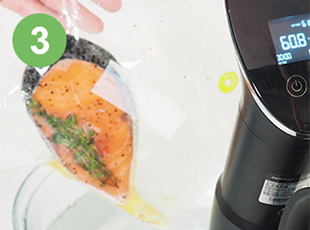 真空抽气完成后放入装有合适水温的锅中慢煮食物至所需程度。