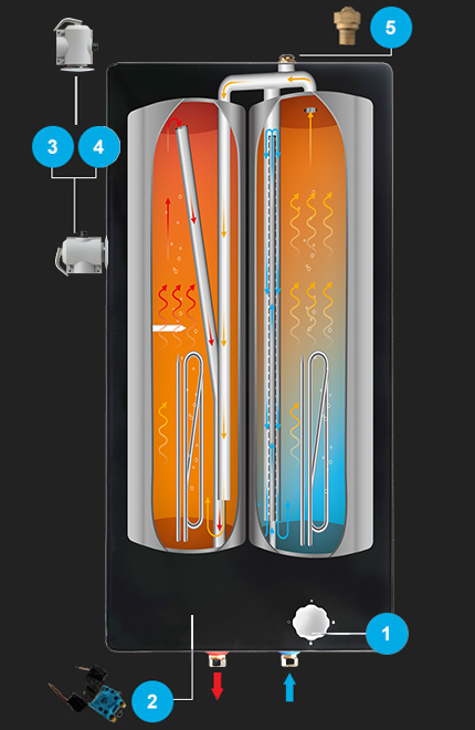 传统单炉胆加热耗时长,消耗能量多;智能调控双胆速热技术,集中热力优先加热部分热水,通过动态热循环迅速把水加热, 5 分钟即达舒适淋浴水温。