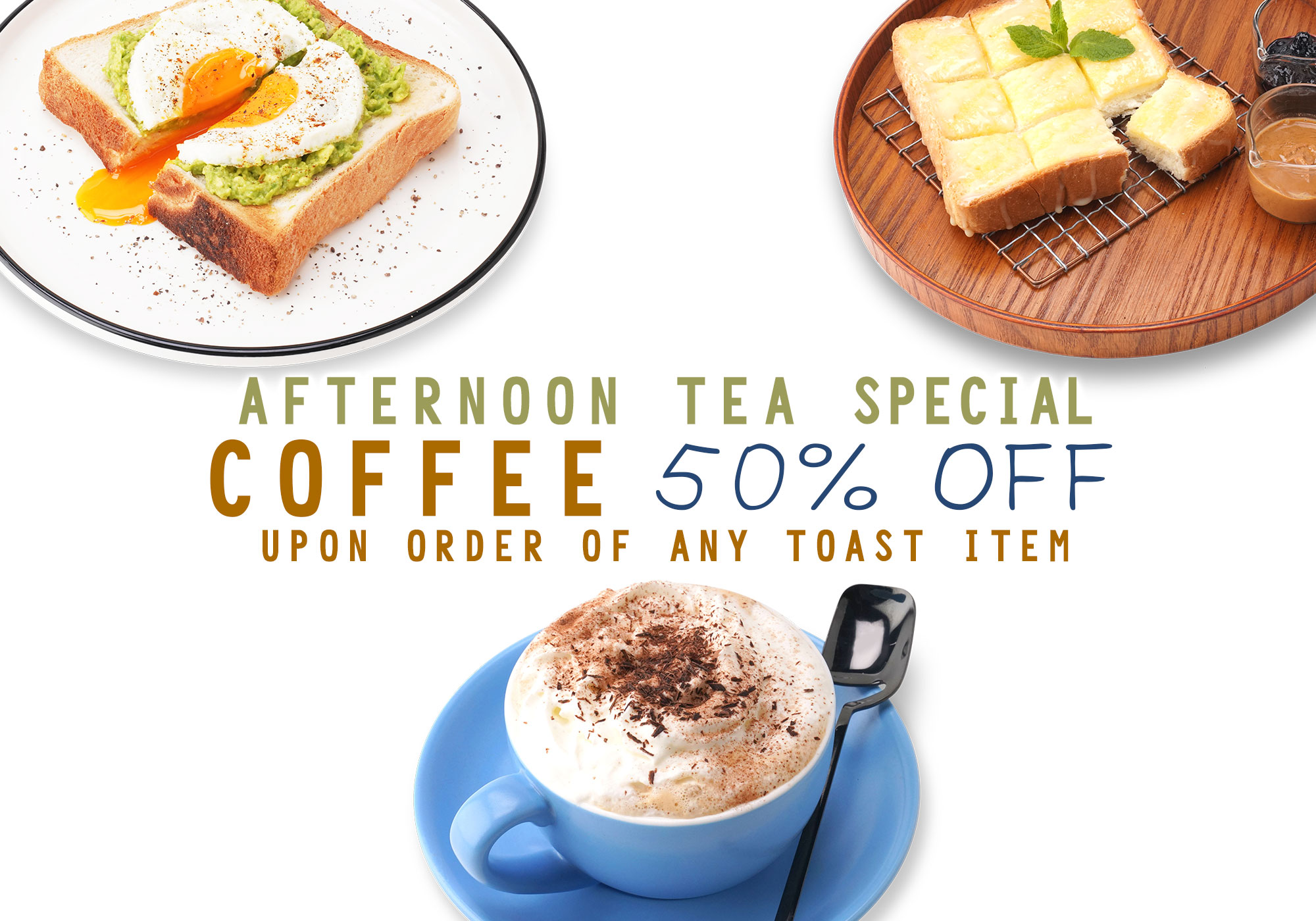 For a limited time only, order any toast at German Pool Happy Kitchen Café during afternoon tea time (2:30PM-6PM), and enjoy an Italian specialty coffee at half price!