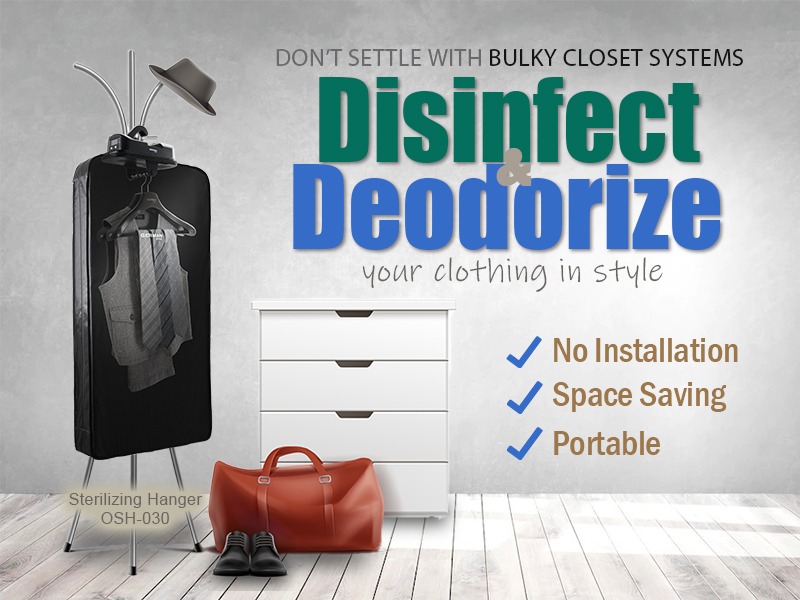 Instead of putting day-old clothes back into the wardrobe, the German Pool brand-new Ozone Sterilizing Hanger (OSH-030) may help. It utilizes ozone to penetrate garment fabrics, kill bacteria swiftly and deodorize concurrently. T-shirts, jeans, non-washable fabrics or personal possessions can all be put inside. Use it right away when you get home to keep germs and viruses out! The hanger can also be placed in car trunk or workplace, so you can sterilize anytime!