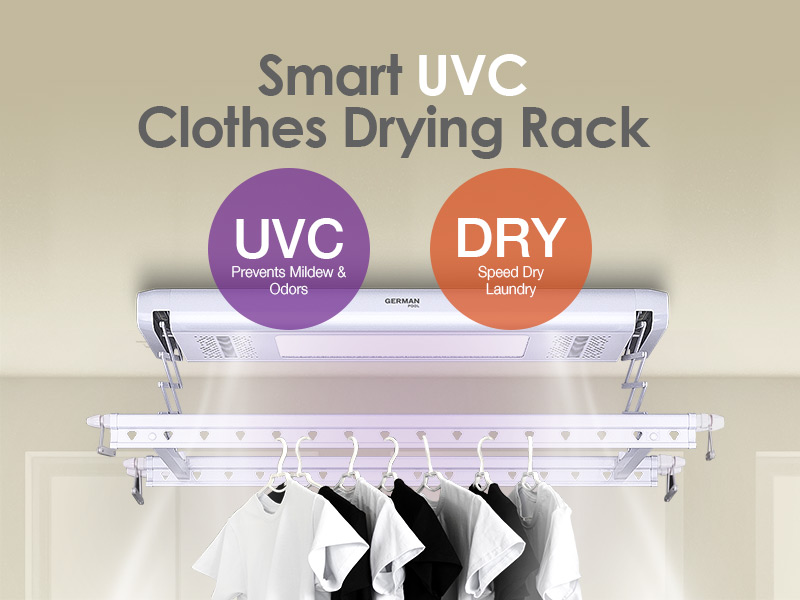 German Pool all new Smart UVC Clothes Drying Rack (ADR-289) is your answer to easy and effortless laundry drying. Designed with HK’s humid weather in mind, the Rack has Air Dry and Heat Dry functions that facilitate laundry drying, as well as UVC sterilization function to eliminate bacteria and prevent mildew on clothing. Fear thick weather or rainy days not! Enjoy all-weather laundry drying with the smart rack. The rack is equipped with auto elevating laundry rods that lower to your eye level at a press. You can also set the lowering level according to your height, easy breezy. No more reaching up hard or stepping on a stool for hanging laundry. The auto-elevating rods are user-friendly to elderlies too.