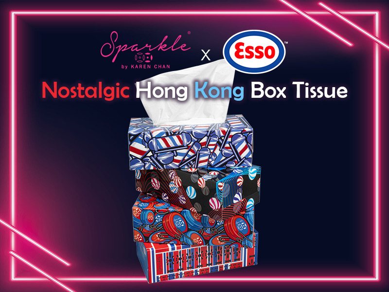SPARKLE by KAREN CHAN launches playful and stylish limited time crossover product with Esso, presenting Hong Kong style “Red-White-Blue” Box Tissue Set: 4 designs of tissue box are themed around ”Nostalgic Hong Kong“, showcasing original pattern designs by SPARKLE COLLECTION and adopting Red-White-Blue colour theme that symbolizes Hong Kong’s can-do Lion Rock spirit. The collection features iconic elements of Hong Kong culture such as 【BARBER TWIRL】of Shanghainese barber shops common in Hong Kong’s neighbourhood in the old days,【WATERMELON BALL】an original toy invention of Hong Kong,【YOYO MOJO】a childhood favourite of many Hong Kong people, and lastly, designed by Mr Ken Fung, Chairman of Design Council of Hong Kong,【STORE GATE】inspired by vintage Hong Kong style grocery stores. The patterns are bright and lively, bringing back warm childhood memory and invoking fuzzy Old Hong Kong nostalgic sentiments, which makes a trendy and delightful series.