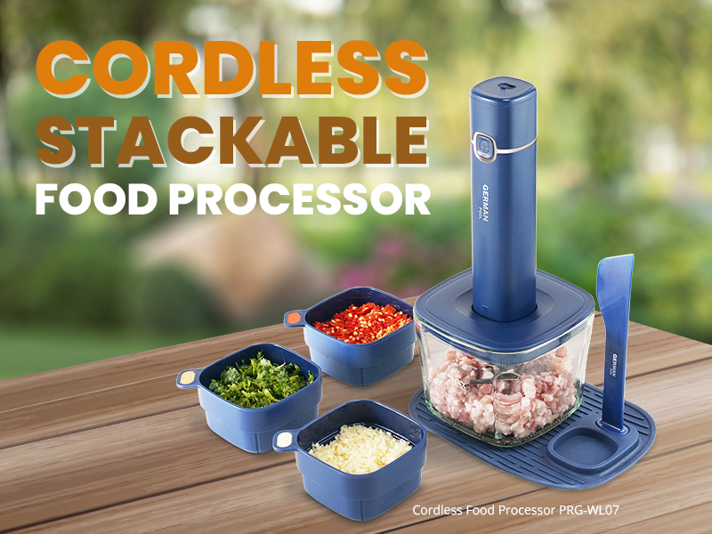 The clutter of conventional food processors and their accessories is a headache to store. When you try to stack them up, they just keep falling all over the place, not to mention they often mysteriously get lost somewhere in the dark abyss of the kitchen cabinet. With its innovative stack-up design, German Pool Cordless Food Processor and its accessories neatly pile up without falling over.