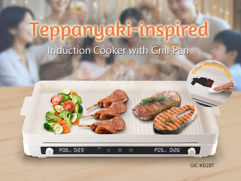 Introducing the all new Free-standing 2-Hob Induction Cooker with Grill Pan (GIC-KD28T) , your perfect cooker for daily meals and home parties! Its ultra-slim 6 cm body is chic and space-saving, not only saving you precious kitchen counter space, it fits perfectly on the dinner table as well! When used together with its complimentary 48 cm extra-wide multifunctional grill pan with lid, the two hobs turn into an all-zone heating surface, together with 2,800 W power, this stylish modern induction cooker is perfect for daily cooking of steaks, lamb racks and even grilled fish, and also perfect for home BBQ parties! The 2 hobs also support all kinds of ferromagnetic cookware, handy for both cooking stews in the kitchen or hotpot at the dinner table!
