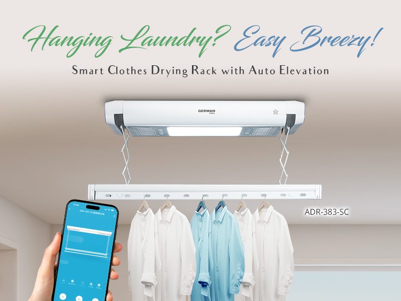 WiFi Smart UV Clothes Drying Rack ADR-383-SC is equipped with automatic elevating laundry rods, simply tap the APP on your cellphone to lower the laundry rods to arm’s length so you can comfortably hang the laundry without standing on tiptoe or having to use laundry forks and step-ladders, making laundry-hanging safe even for the petite or elderly.