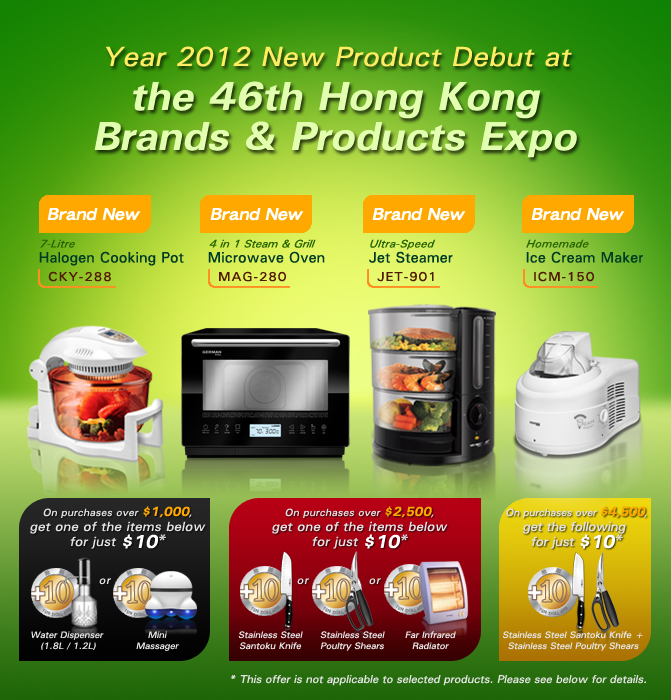 Once again, German Pool\'s booth is one of the largest at the HKBPE. German Pool showcases over 40 items of brand new electrical appliances as well as kitchen cabinetry and kitchen accessories including Jet Steamer, 7-Litre Halogen Cooking Pot, 4-in-1 Steam & Grill Microwave Oven , Homemade Ice Cream Maker, Heater, Food Processor, Range Hood, Portable Induction Cooker, Gas Cooking Range, Massager, and Far Infrared Health Care Series. All products will be sold at a special promotional price during the expo.