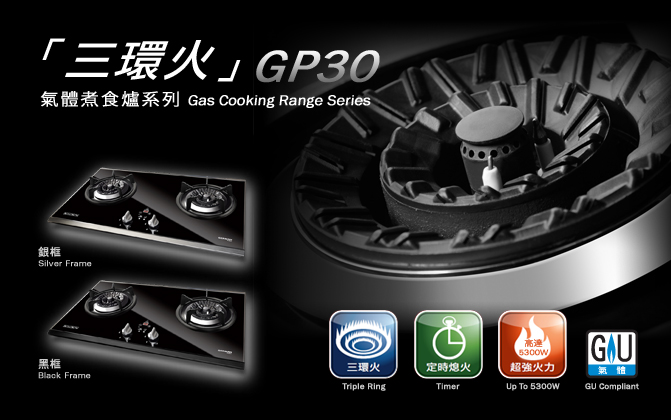 The all new GP30 "Triple Ring" Gas Cooking Range Series features a cooking power of up to 5,300 W. Its triple-ring burner offers an extra high efficiency and stability. With 3 independent burner rings, either high-power stir-fry flame or steady simmer flame is easily achieved with just a turn of the knob. The GP30 also comes with a very helpful function - a timer that automatically switches the burner off at a pre-set time - making it convenient and safe to use.