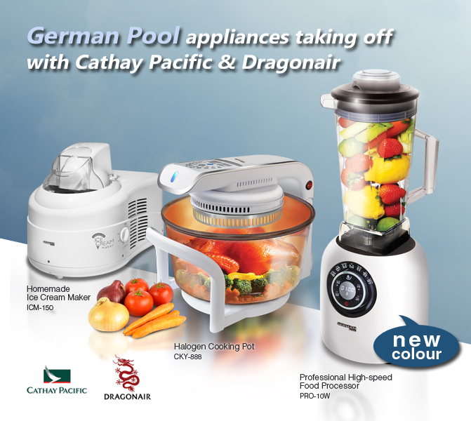 A selection of German Pool lifestyle appliances is taking off with Cathay Pacific and Dragonair! Beginning 1 April 2013, passengers on Cathay Pacific and Dragonair flights can order selected German Pool products via the airlines’ inflight magazines. Cathay Pacific carries the Multi-purpose Halogen Cooking Pot CKY-888 and Homemade Ice Cream Maker ICM-150, while Dragonair offers the Multi-purpose Halogen Cooking Pot CKY-888 and Professional High-Speed Food Processer PRO-10 (available in purple and the brand-new white colors), allowing passengers to enrich their home life while in the sky.