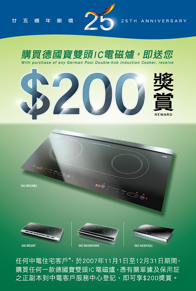 From 1 Nov to 31 Dec 2007, CLP domestic customers* can enjoy $200 reward upon presentation of the sales receipt and warranty card (original and copy) for purchase of any German Pool double-hob IC Induction Cooker.