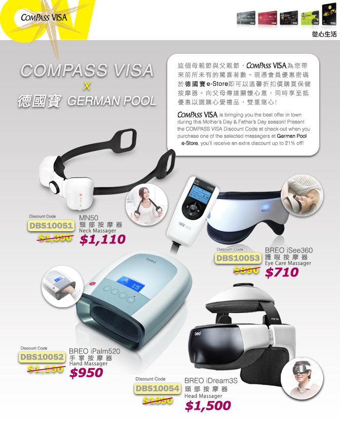 COMPASS VISA is bringing you best offer in town during this Mother Day & Father Day season! Present the COMPASS VISA Discount Code at check-out when you purchase one of the selected massagers at German Pool e-Store. You will receive an extra discount up to 21% off!