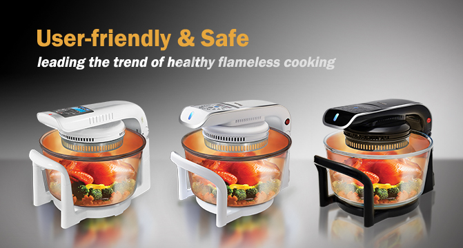 German Pool Halogen Cooking Pot is capable of toasting, grilling, baking, roasting, braising, pan-frying, steaming, simmering, de-frosting, and re-heating, proving its superiority over traditional ovens or open flame barbecues. The Halogen Cooking Pot uses three methods to cook food: heat conduction via a metal rack; heat penetration thanks to far infrared technology, and heat convection with the reinforced glass cooking pot which took thermodynamics into its design considerations. This product has a rated power of only 1,300W, drawing little electricity to cook food using the three aforementioned heating methods. Halogen Cooking Pot reduces cooking time, thus energy consumption and costs.