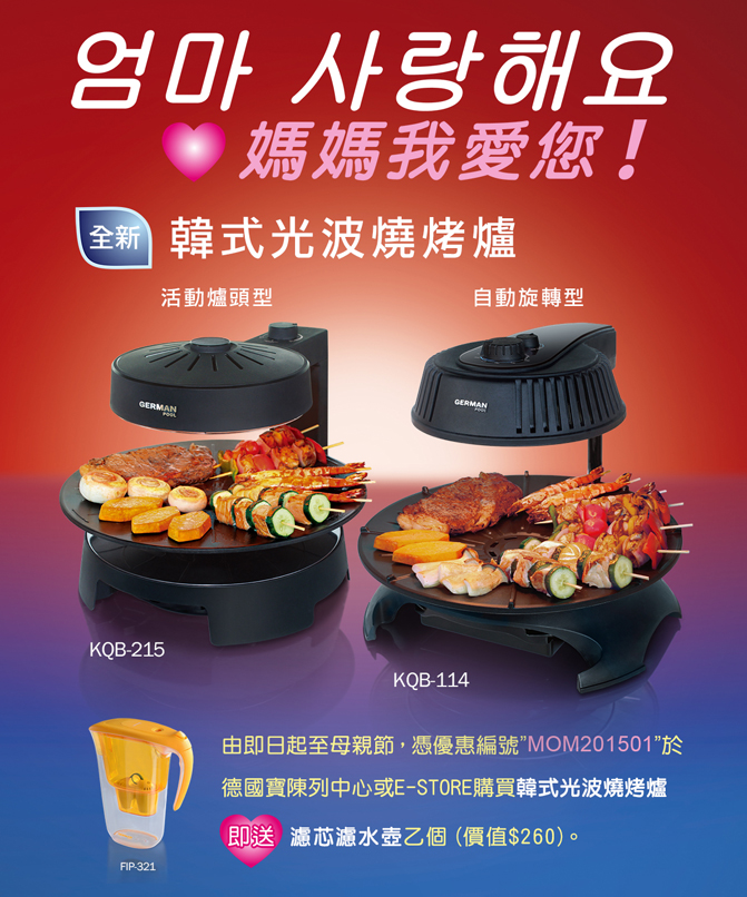 Mother's Day is just around the corner, have you prepared your gif to regale mother's years of hard toil yet? From now on to May 10- Mother’s Day (Sunday), present the Promo Code:MOM201501 at any German Pool showroom or the German Pool e-Store to get a complimentary water filter pitcher (FIP-321Y), worth $260, with any purchase of the Korean Electric Barbecue Grill.