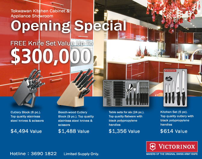 In celebration of the grand opening of the brand new German Pool Kitchen Cabinety & Home Appliance Showroom in Tokwawan, Kowloon, German Pool (HK) Co. Ltd. is giving away Victorinox kitchen knife sets (total value up to $300,000). Enjoy this great special offer by simply purchasing German Pool kitchen cabinet packages and home appliance products at any of the participating retail outlets*. Promotion starts on 15 August, 2008 and ends on 15 October, 2008.