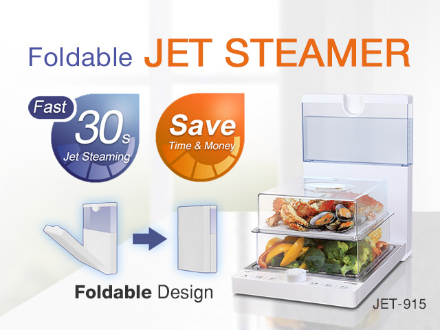 The brand new JET-915 Foldable Jet Steamer is ideal for cooking various types of food such as seafood, vegetables and meat. It is perfect for preparing a dinner for two as well as a party for a large group of people. Heat is distributed evenly inside the Jet Steamer, retaining nutrients and moisture. The original taste and flavour of food is brought out.