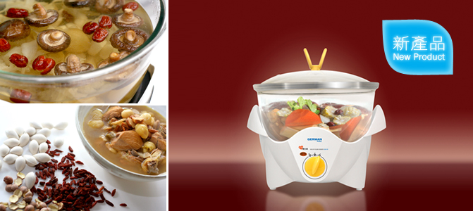 German Pool's latest product, Healthy Slow Cooker, is an all-new cooker especially designed for making nutritious soup. This multi-functional cooker can cook Chinese herbal soup, double-boiled soup, stew/carbonnade, congee and braised food.