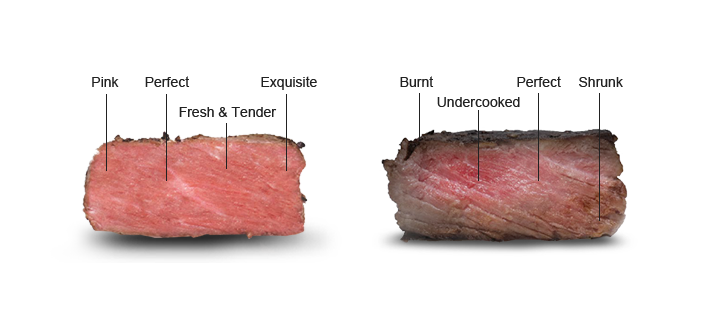 The steak on the left is cooked with the sous vide method. The meat is thoroughly pink, evenly tender, and full of juice. The steak on the right is pan-fried conventionally. The heat is dehydrated and tough, with a burnt surface and a raw centre.