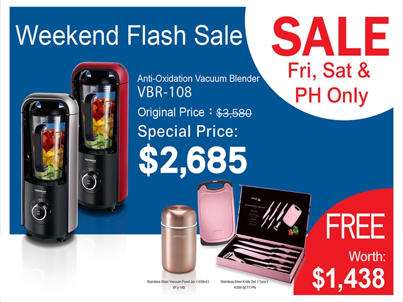 German Pool Crazy Flash Sale starts on this coming weekend ! From 26 July to 28 July, you can bring our popular Anti-Oxidation Vacuum Blender (VBR-108) home at a shocking price of $2685 exclusively from our Kowloon Bay MegaBox showroom. What's more, you can get Stainless Steel Vacuum Food Jar (VFJ-140) and Stainless Steel Knife Set 7 pcs (KSW-SET7-PN) for free upon purchase of Anti-Oxidation Vacuum Blender. All the gifts worth a total of $1,438. Don't miss this chance!