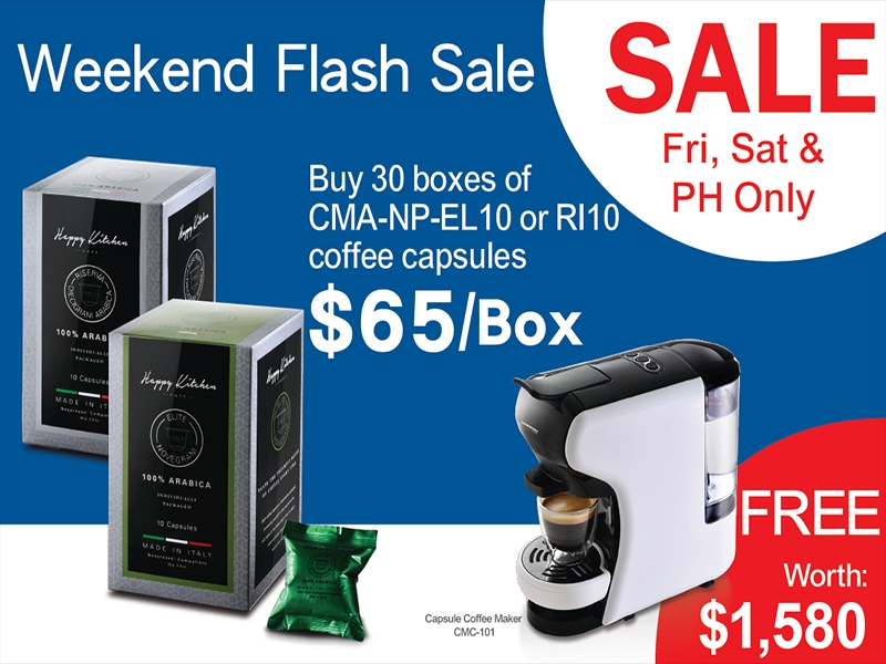 German Pool Flash Sale starts on this coming weekend ! From 9 to 11 August, you can bring our Capsule Coffee Maker (CMC-101) home for free when you buy 30 boxes of designated Happy Kitchen Coffee Capsules (CMA-NP-EL10 / CMA-NP-RI10). Gift is worth a total of $1,580. Don't miss this chance!