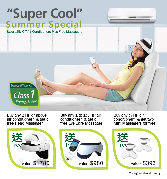 German Pool “Super Cool” Summer Special starts from 26 March – upon purchase of a German Pool Air Conditioner, you can enjoy an extra 15% off and get a free massager at the same time! The new 2009 Air Conditioner Series brings you refreshingly “cool” breeze, while the comforting massagers make you feel just as “cool”. With the huge discounts and double pleasure, it is such a cool offer you shouldn’t miss out.