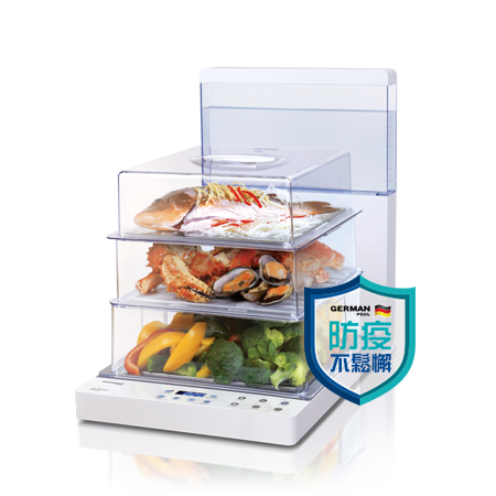 The patented jet steaming technology of the German Pool Foldable Jet Steamer (JET-920) starts ejecting high-temperature steam within 30 seconds. Heat is distributed evenly inside the Steamer, facilitating fast and thorough cooking. Three layers of steaming baskets can be used together to steam-cook multiple dishes at the same time, or you can remove the rack to achieve an extra-large 18.8 L capacity off a single compartment and put a whole chicken in. When it’s not in use, it can be folded up to as thin as 9cm – tuck away, and take it out only when you need it!