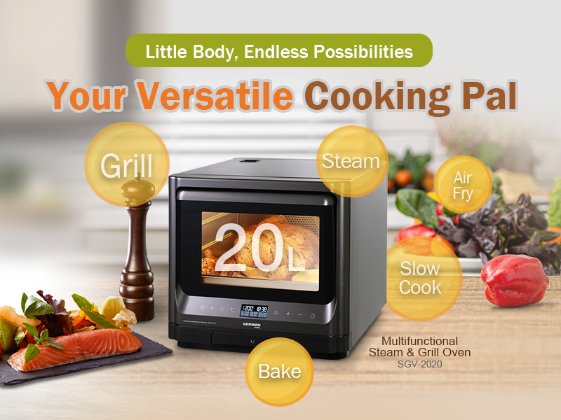 We proudly introduce the brand new Mini Multifunctional Steam & Grill Oven (SGV-2020), your all in one appliance that replaces steamer, oven, slow cooker, air fryer and other cooking appliances. The 36cm wide ultra-mini body is the best fit for kitchenettes and the ultimate money-and-space-saver!