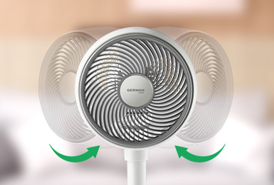 German Pool DC Inverter Air Circulation Fan features automatic vertical and horizontal oscillation functions, delivering 3D cool breeze to a larger and wider area compared to traditional fans, facilitating air circulation and promoting indoor and outdoor air exchange, keeping the room cool and the air fresh.