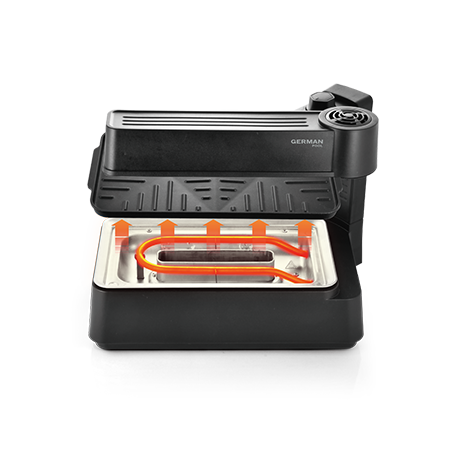 Place the grill pan and oil reservoir at the correct positions and switch on the power. The oil reservoir will make a "crack" sound if correctly installed. Wait for 5 minutes for the grill pan to heat up before grilling anything to ensure fast and thorough cooking.