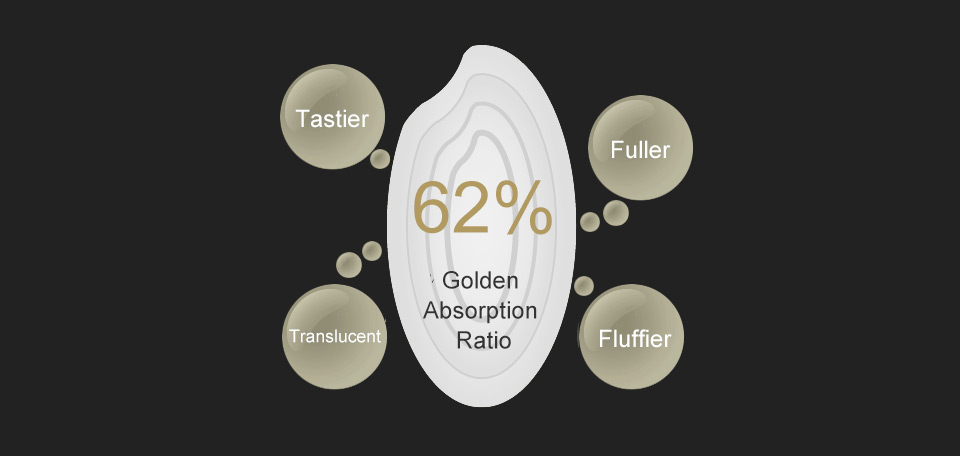 Having the cook time and temperature precisely adjusted, acquiring the 62% golden water absorption ratio is a piece of cake. Each grain of rice is chewy, crystal-like and plump.