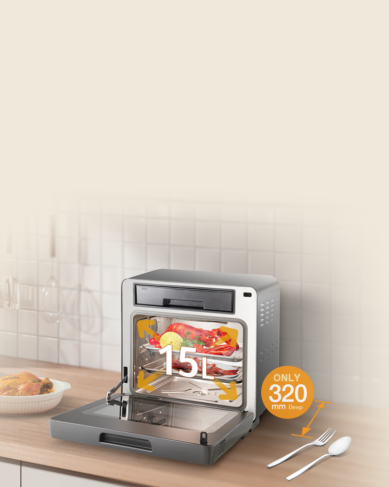 Mini Multifunctional Steam Grill Oven is sleek and compact at only approx. 34 cm in width, perfect for tiny kitchens, yet it houses a 15 L rated capacity that can fit in a whole chicken or fish. Its 3 cooking tiers allow for cooking multiple dishes at once, saving you precious time and electricity.