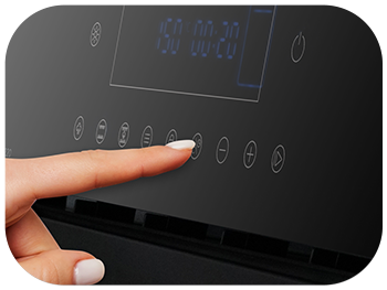 The stylish touchscreen panel shows the temperature, time and functions clearly.
