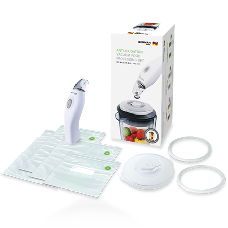 The German Pool Anti-Oxidation Vacuum Food Processing Set comes with the Vacuum Lid, Sealing Rings and Vacuum Zipper Bags of different sizes. Enjoy vacuum-sealed food at home without having to purchase additional accessories!