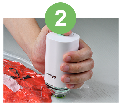 Press vacuum sealer tip flat against air valve. Press the ON button to remove air from bag.
