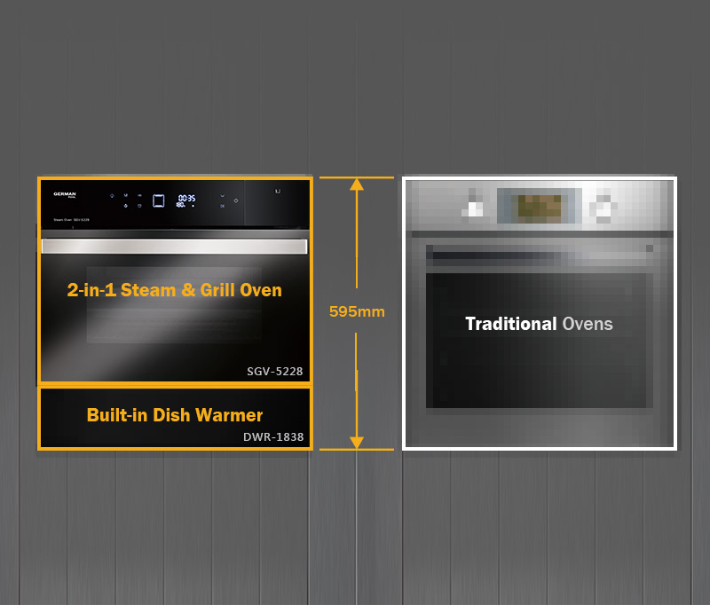 Install the Built-in Dish Warmer together with a steam grill oven, and their combined height of 595 mm perfectly replaces the size of a standard built-in oven, saving you the money and effort of reconstructing your kitchen cabinet.