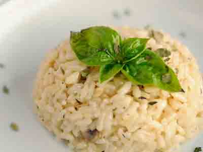 加入洋葱、干葱、蒜头及香草碎,关盖爆炒1分钟;倒入意大利米及鸡汤 (汤刚盖着米),关盖炒约6分钟。中途酌量添加上汤。