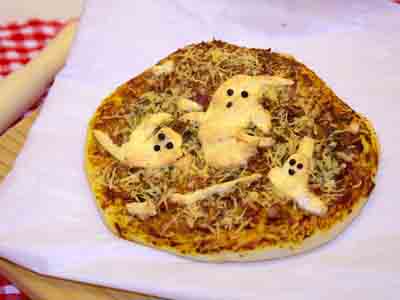 光波炉放入低架、烘盘及薄饼,以190-200℃焗15-20分钟。最后加上裁好的芝士片装饰即可。