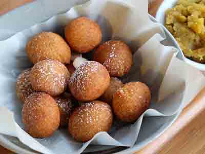 炸至金黄色,捞起撒上糖霜即成。