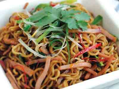 智能电炒锅放少许油,顺序放入葱段、火腿丝、红椒丝和面,最后淋上调味料,关盖。