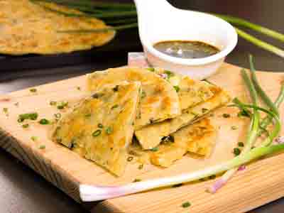 八宝锅加入油,选择「煎」功能,按「开始」,放入葱油饼煎至两面金黄即可。