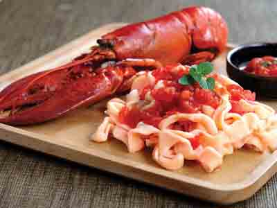 龍蝦洗淨,放入高速多層電蒸鍋中蒸8分鐘至熟,去殼切成1cm厚小塊備用。