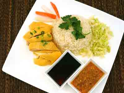 米洗淨,放入電飯煲內,加入清雞湯、鹽、香茅、姜、斑蘭葉及蒜頭。