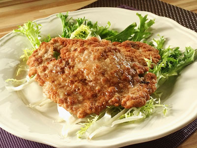 将整件芝心猪扒沾上生粉后,沾上蛋浆,再沾上面包糠至均匀。