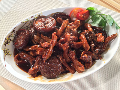 先将干草菇爆香备用,再将葱头爆香,加入鸭舌煎香。