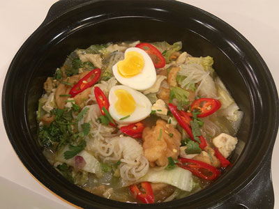 将绍菜切小块,再放入汤中,并加入芋丝和鱼腐。